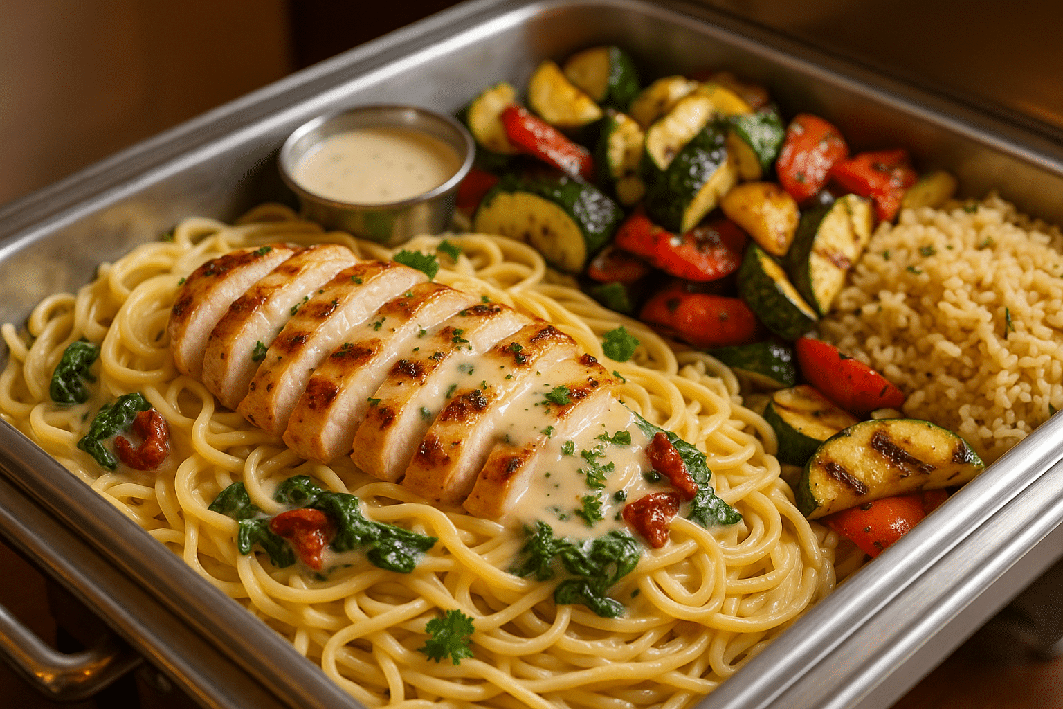 Chicken breast served over pasta with spinach, sun-dried tomatoes, and cream sauce. Drinks and desserts