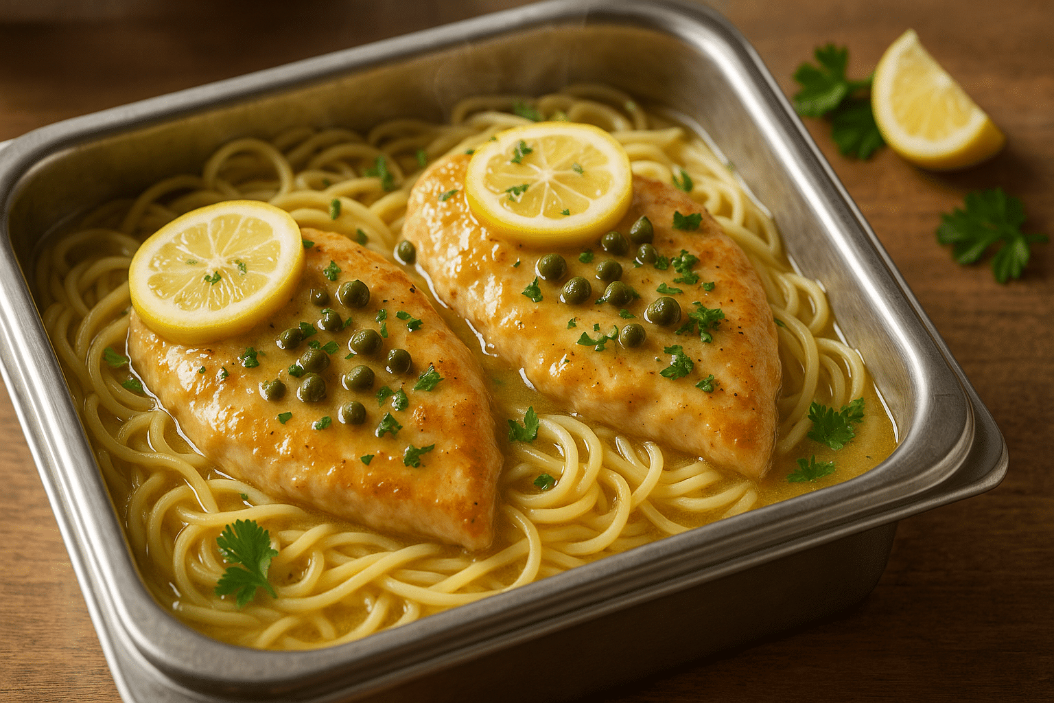 Chicken with capers and lemon butter. Served with spaghetti. Minimum of 5 orders.