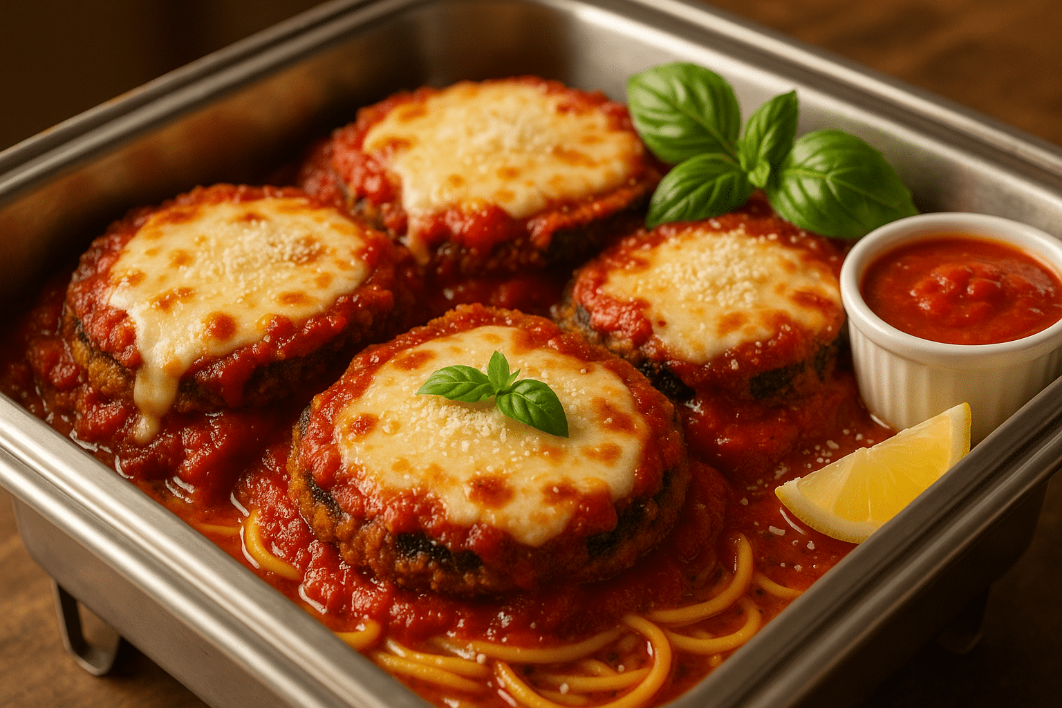 Breaded & fried eggplant with marinara sauce and mozzarella. Served with pasta Minimum of 5 orders.