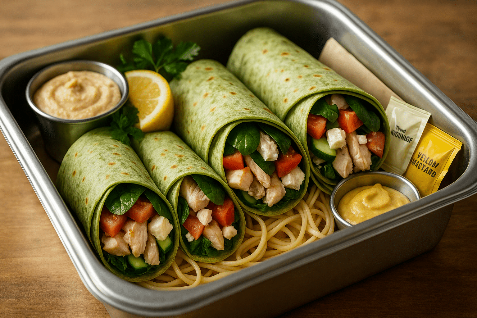 Chicken breast, spinach, feta, cucumber, tomato, and hummus on a spinach wrap. Minimum 5