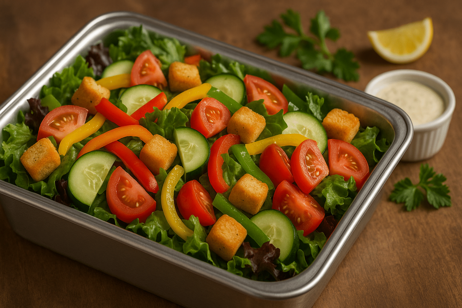 Mixed greens with bell peppers, cucumber, tomato, croutons, and choice of dressing. Serves 15