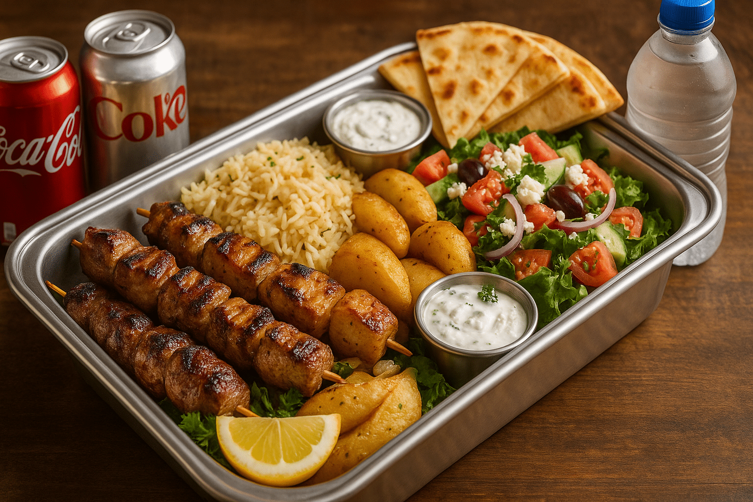 Choice of skewers with rice pilaf, oven-roasted Greek potatoes, Greek salad, pita bread, and assorted drinks.