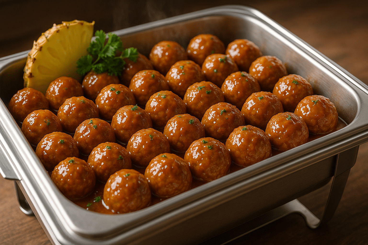 Lean beef meatballs in homemade pineapple glaze sauce (25 pieces). Serves 8